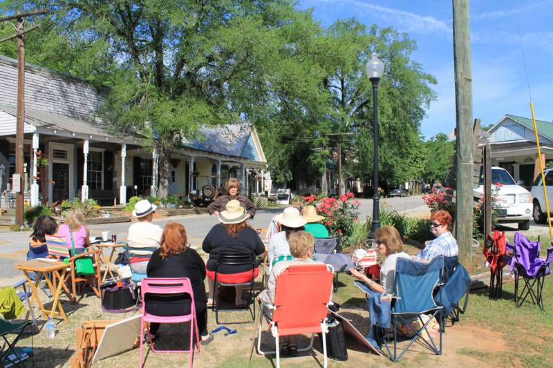 Our Fried Green Paints Event was a great deal of fun. What could go wrong with amazing southern cooking, your best girl friends and paint. It’s the recipe for an amazing day which is just what we had. Our day began with a walk about town scoping out good spots to draw and paint. Once we settled on our sites to work from Lydia Ellis and I did a demo to show how perspective can be captured to create a great piece of art using pastels and watercolors.