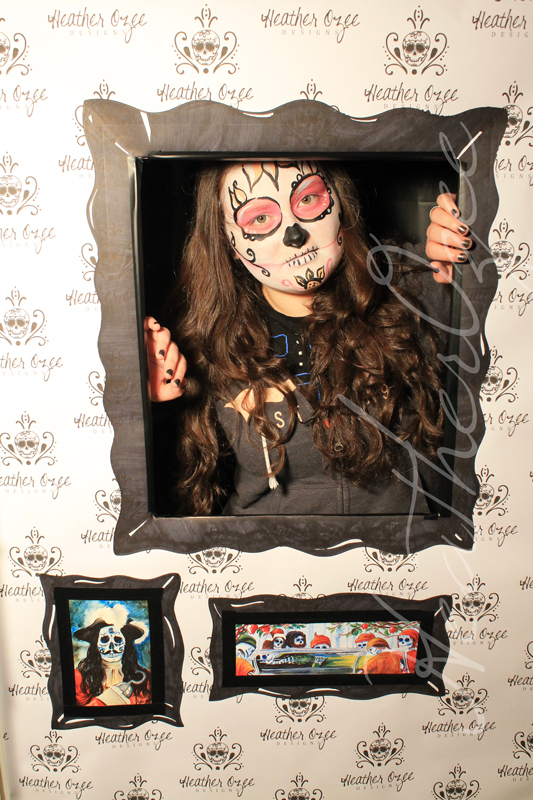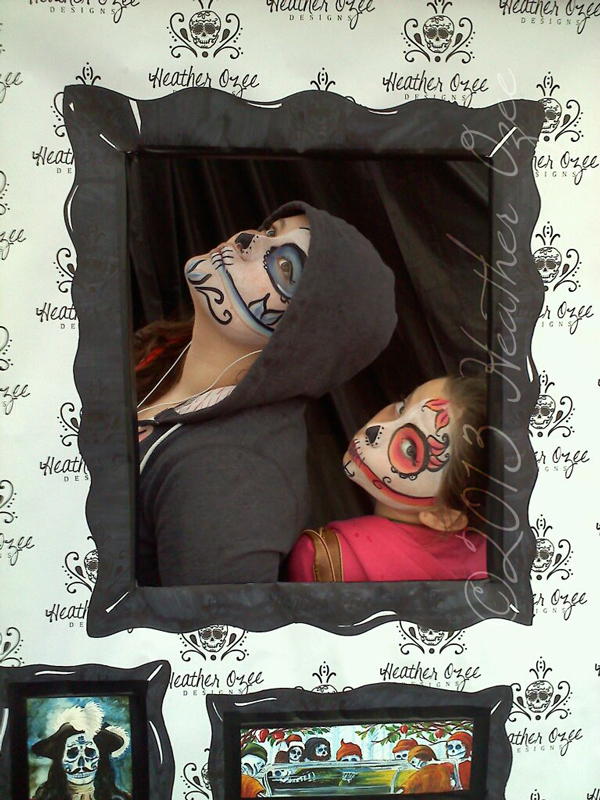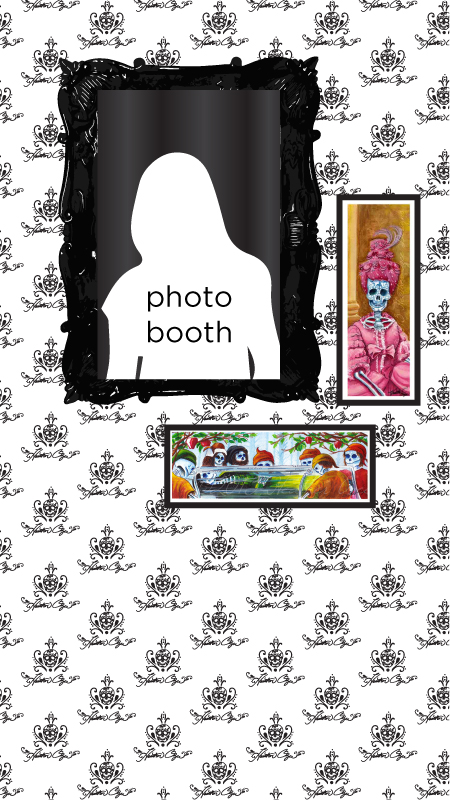 SO my Geranium Festival booth will feature my Day of The Dead Fairytale Series. My wonderful boss Lance had the BRILLIANT idea to do day of the dead face painting! Then I was struck with an add on idea... PHOTO BOOTH!!!! Those are so hot at the moment. You can go onto pinterest without seeing one or two here and there. And then I came across this sweet photo booth idea on pinterest. I fell in love immediately.... with the one it instantly brought to life in my head. The one in my head had a similar wallpaper but with my name so that all photos that were facebooked or shared in other ways had who did it and where to get your art or face painting! And that instead of Gran and Grandpa in the other frames it would be my lovely little dead folks ;)